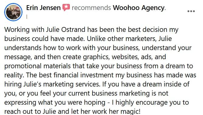 Julie Ostrand is the founder of Woohoo Agency, in Omaha, Nebraska, known for turning messy brand ideas into clear, compelling campaigns that convert.